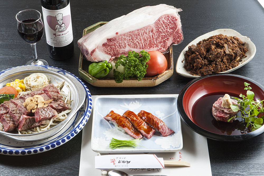 特選飛騨牛のローストビーフ(60g)│口取り2品│特選飛騨牛のにぎり│本日の魚介料理│キャビアのコンソメゼリー│ステーキ ※特選飛騨牛(ヒレ100g)│サラダ│タンのスープ│パン or ごはん│デザート